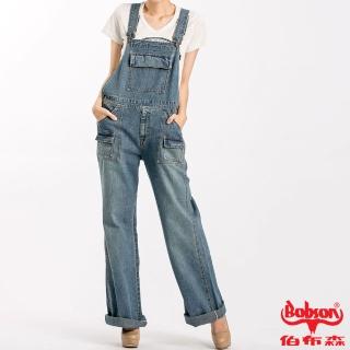 【BOBSON】女款低腰刷白牛仔吊帶長褲(淺藍58)