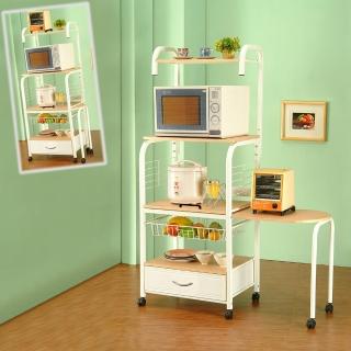 附三個插座方便使用電器,四層式收納設計分門別類好收納,鐵線收納籃與收納抽屜並具,最上層板高度可四段調整