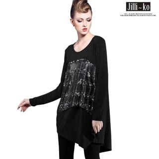 【JILLI-KO 歐美設計】造型亮片點綴長版上衣(黑/灰)