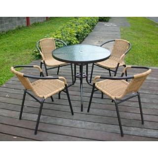 材質採鐵框鐵腳烤漆安全玻璃桌面,桌面中央附孔洞可擺放各式太陽傘,藤椅黑色鐵管烤漆+PE藤皮包覆