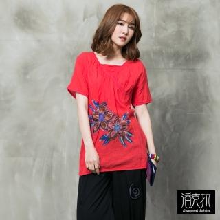 【潘克拉】Y字斜領印花捲T-F(桃/綠/藍)