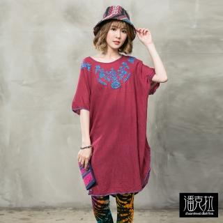【潘克拉】連袖側開岔繡花長捲T(紅)