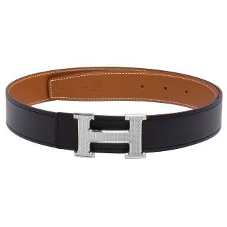 【HERMES】銀色菱格紋H LOGO雙面用小牛皮腰帶/皮帶(90CM-黑X棕H052000-H064540-BLK-BROWN-ARG)