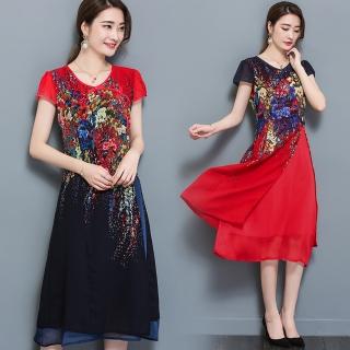 【ALICAI 艾麗彩】潑墨花朵繩結點綴開叉雙層紗裙洋裝(中大碼/二色/L-4XL)