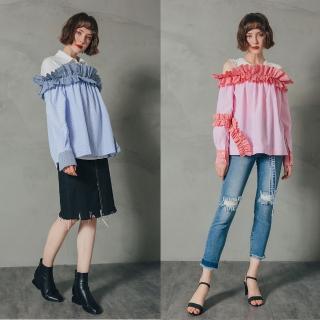 【Who Cares】法式浪漫設計感不收邊壓褶格紋露肩上衣(露肩上衣)