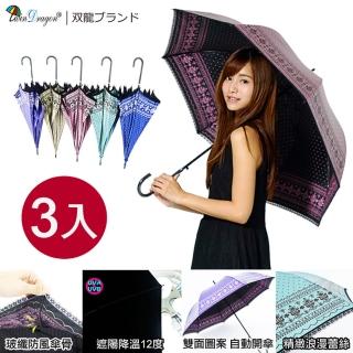 【雙龍牌】洛可可黑膠雙面圖案蕾絲宮廷傘直立傘(3入防曬抗UV自動晴雨傘超輕量陽傘A6160B-3)