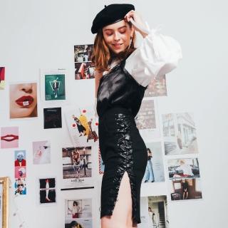 【Who Cares】個性側邊皮革拼接金屬環窄裙(兩色任選)
