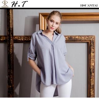 【玄太】V領反摺袖長板純色造型上衣(藍)
