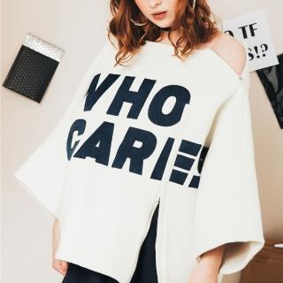 一字領平口造型。,WHO CARES字樣設計。,寬鬆袖襬不限身型皆適合穿著。
