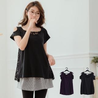 【衣心衣意中大尺碼】現貨-日系裸肩造型蕾絲長版上衣(黑色-紫色A1315)