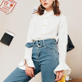 拼接襯衫特色。,多層次造型。,喇叭袖口造型讓穿搭更俐落。