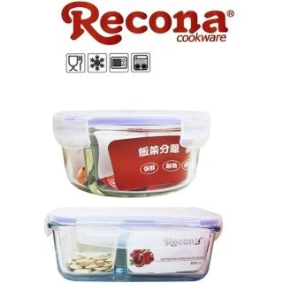 【Recona】圓形+長形 400°C耐熱分格玻璃保鮮盒800mlx2入隨機 贈便當袋/便當盒/保鮮盒(3件組)