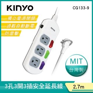 【KINYO】3開3插安全延長線2.7M(CG133-9)