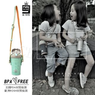 【韓國PURENINE】Kids兒童頂級時尚彈蓋隨身多功能保溫杯-290ML附皮杯套+背帶(湖綠色皮套+灰蓋瓶組)