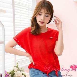 【lingling】下擺鬆緊可綁蝶結釘珠短袖上衣PA3828(共二色)