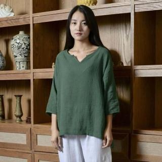 【BBHONEY】寬鬆大碼V領棉麻七分袖純色上衣(無印風棉麻上衣)