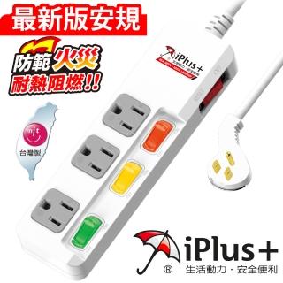 【保護傘】4開3插防火抗雷擊扁插延長線1.8m(PU-3435)