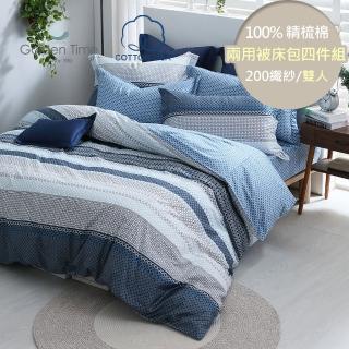 【GOLDEN-TIME】精梳棉兩用被床包組微復古-藍(雙人)