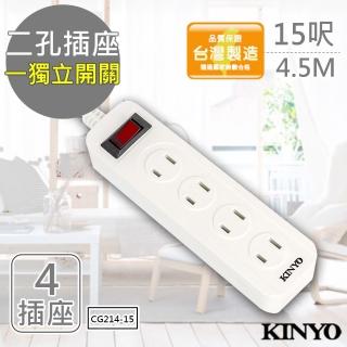 【KINYO】15呎 2P一開四插安全延長線-台灣製/新安規(CG214-15)