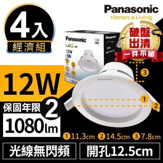 【Panasonic 國際牌】4入組 LED崁燈 12W 12.5cm 無閃頻 全電壓 附快速接頭 保固兩年(白光/自然光/黃光)