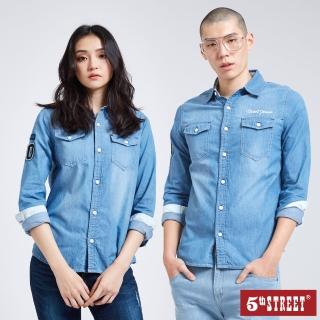【5th STREET】中性款毛巾繡牛仔長袖襯衫-拔洗藍
