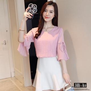 【JILLI-KO】V領喇叭袖雪紡短袖上衣 -F(粉/白)