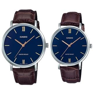 【CASIO 卡西歐】簡約指針對錶 皮革錶帶 藍色錶面 日常生活防水(MTP-VT01L-2B+LTP-VT01L-2B)