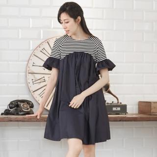 【Abbie】韓版落肩荷葉拼接條紋洋裝(現貨熱銷中)
