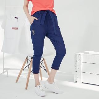 前片口袋下方運用拉鍊及品牌織帶,運用本布做寬版腰綁帶的設計,七分褲長及褲口羅紋設計貼合腿