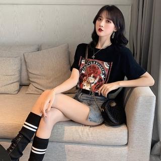 【BBHONEY】韓版俏皮招貼貓印花T牛仔短褲套裝女(網美必備二件套)