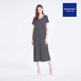 【Gennies 奇妮】長版假兩件哺乳洋裝(黑底白條T1H15)