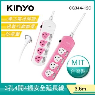 【KINYO】4開4插安全延長線3.6M-顏色隨機(CG344-12C)