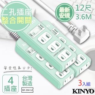 【KINYO】12呎 2P一開四插安全延長線台灣製造•新安規-3入組(SD-214-12)