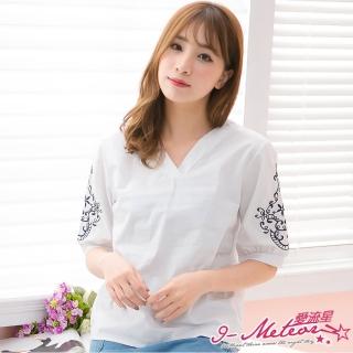 【I-meteor】中大尺碼-V領小露背燈籠袖刺繡短袖上衣PA3732(典雅白)