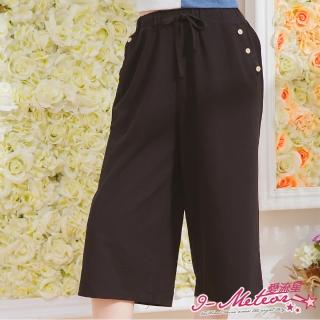 【I-meteor】中大尺碼-腰鬆緊綁結口袋飾釦七分長寬褲PA3777(百搭黑)