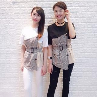 【BBHONEY】不規則拼接短袖寬鬆收腰撞色格子中長版假兩件式上衣(正韓代購實拍)