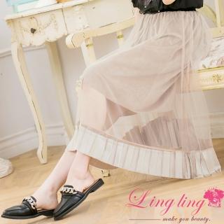 【lingling】絨布接紗七分百褶圓裙PA3335(氣質杏膚)