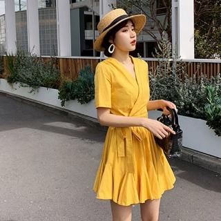 【BBHONEY】時尚純色綁帶V領短袖上衣短裙套裝(甜美韓風套裝)