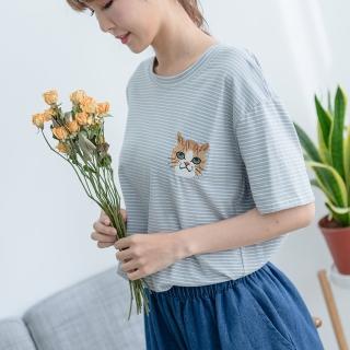 【慢。生活】貓咪刺繡條紋短袖T-F(藍/紅)