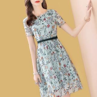 【FQ時尚天后】青綠橘花深綠蕾絲腰飾洋裝(S-2XL)