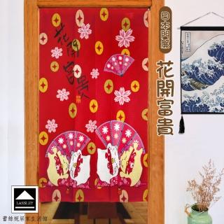 【LASSLEY】日本門簾-花開富貴 85X150cm(日式 和風 招財貓 雙開式 風水簾 一片式)