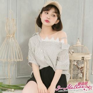 【I-meteor】中大尺碼-條紋襯衫領睫毛蕾絲露肩襯衫上衣PA4115(簡約白)