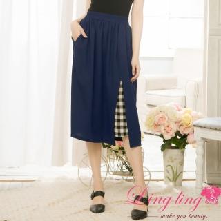 【I-meteor】中大尺碼-素色開叉設計內層格紋右隱藏口袋長裙PA4212-01(神秘深藍)
