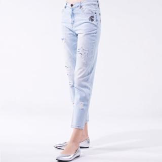箱子娃娃異想世界系列-與恐龍,經典窄直筒版型,淺色丹寧微刷色,修飾顯瘦有型,精緻娃娃刺繡設計