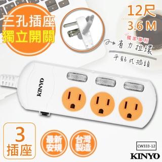 【KINYO】12呎3.6M 3P3開3插安全延長線台灣製造•新安規(CW333-12)