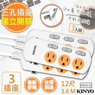 【KINYO】12呎3.6M 3P3開3插安全延長線台灣製造•新安規-3入組(CW333-12)