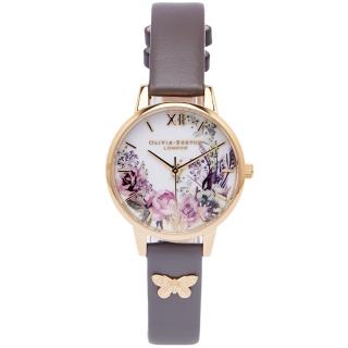 【Olivia Burton】蝶飛花卉皮革手錶-白面X灰色/30mm(OB16EG109)