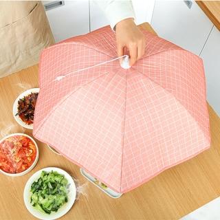 可折疊,不用時可收平,不佔空間,讓飯菜保持衛生、保溫,防蟲防蚊,6根骨架立體展開,頂部可掛式