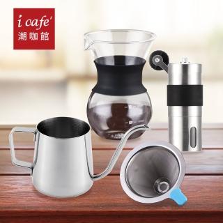 【icafe潮咖館】DIY手沖咖啡四件組(研磨機/手沖壺/濾網/分享壺)