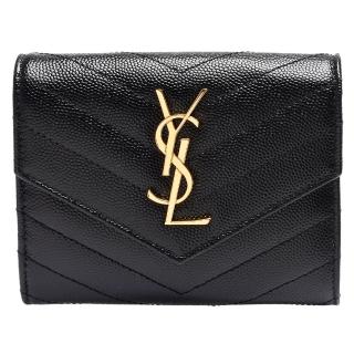 【YSL】MONOGRAM系列V字縫線魚子醬牛皮金色金屬LOGO暗釦三摺短夾(黑403943-BOW01-1000)